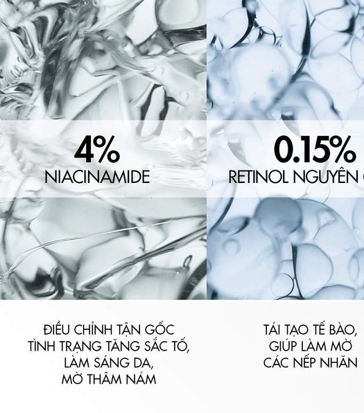 - 0.15% Retinol nguyên chất: Tái tạo tế bào, giúp làm mờ các nếp nhăn